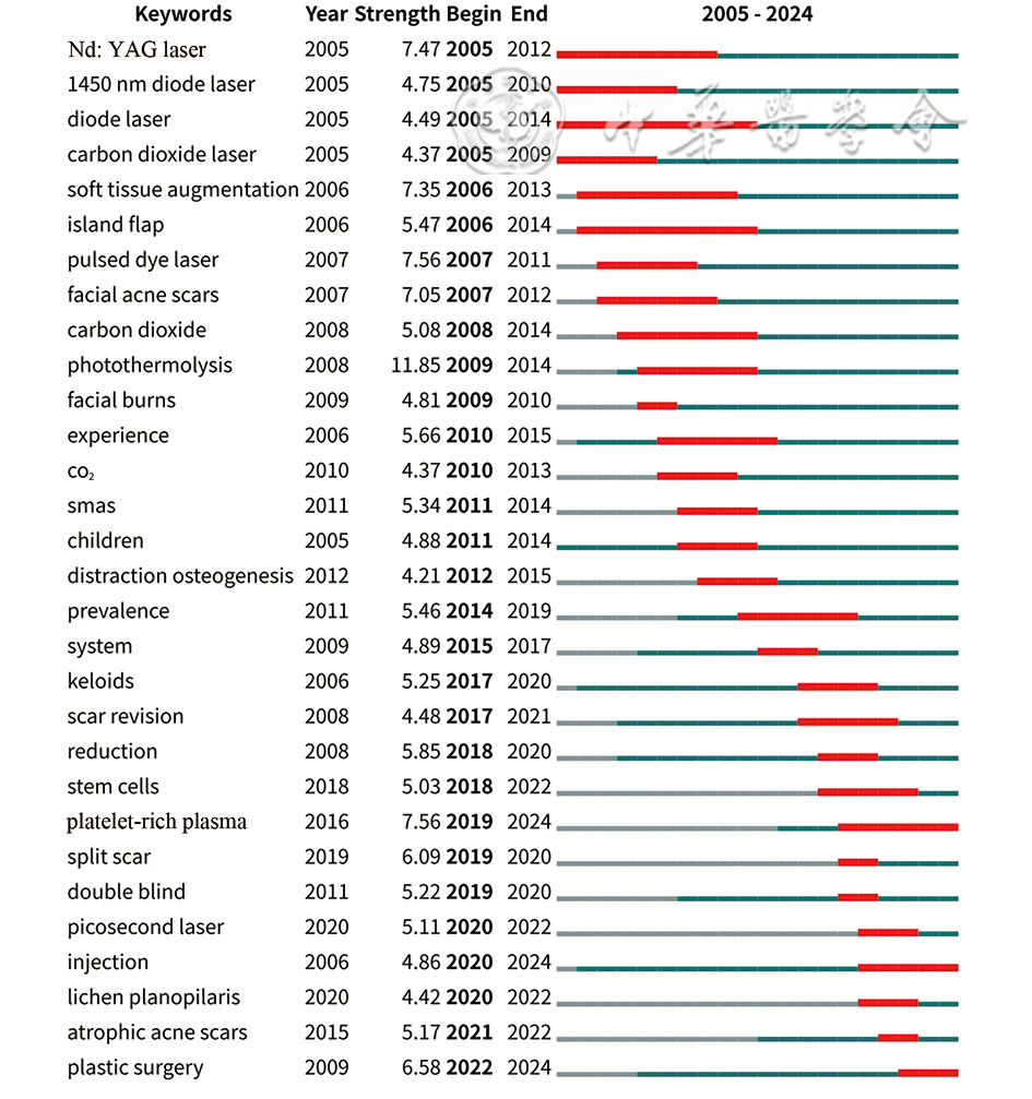 黄雅婷,陈星翰,肖海涛,等. 瘢痕疙瘩研究热点与趋势:2004-2023年文献计量分析与可视化[J]. 中国美容整形外科杂志,2025,36(5):311-319.